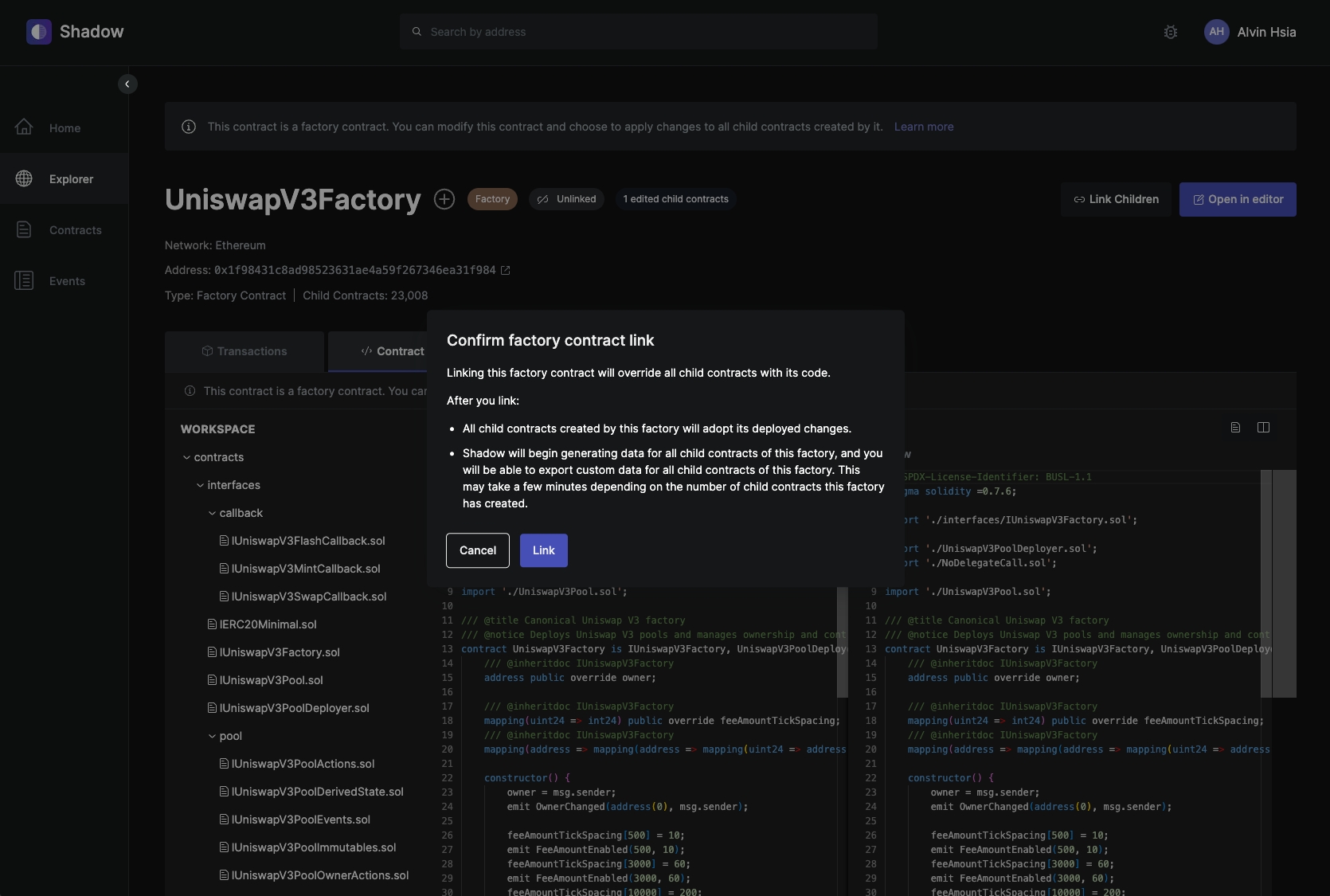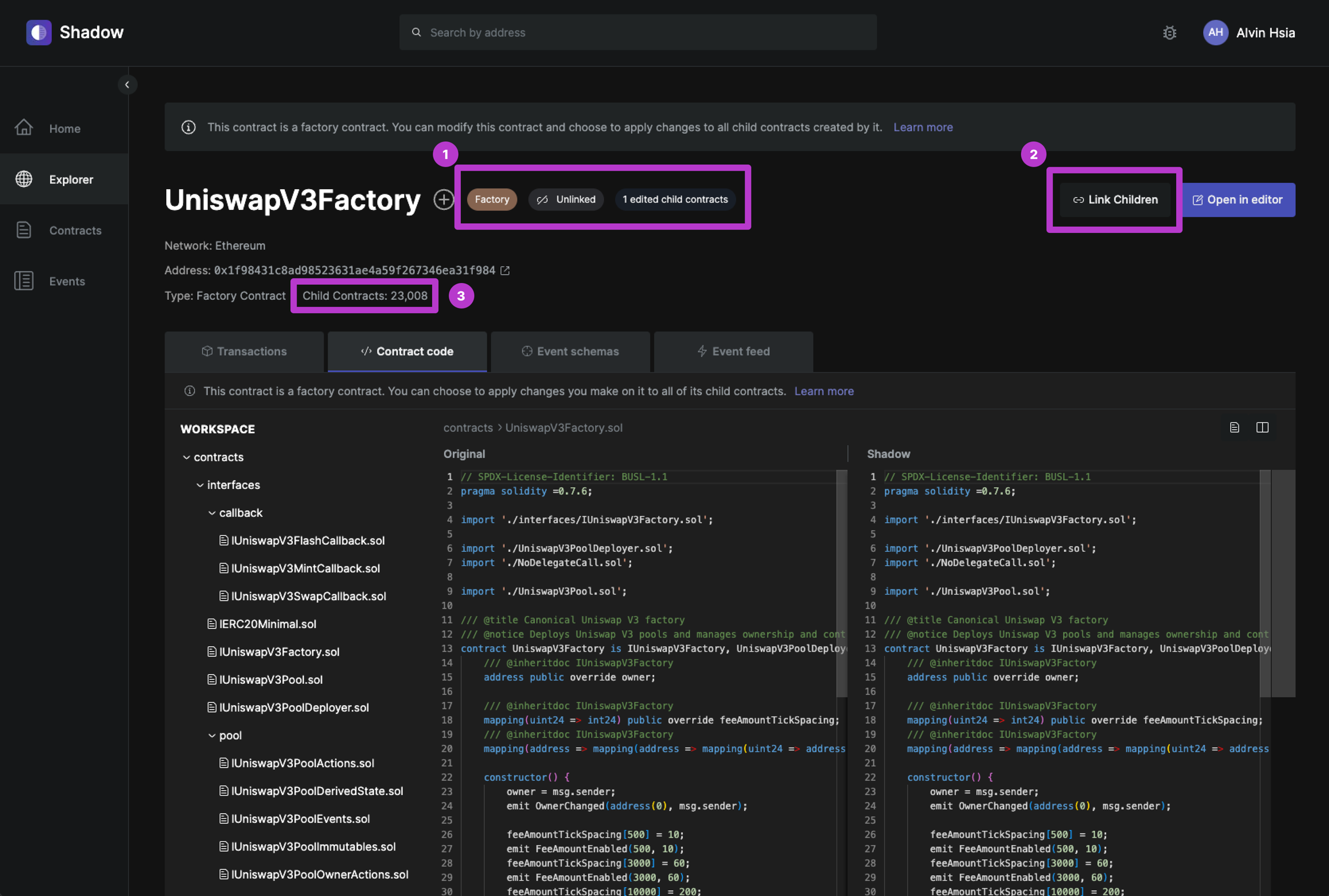 Shadow automatically detects if a contract is a factory contract, or a child contract deployed by a factory contract. On the contract page, you will: