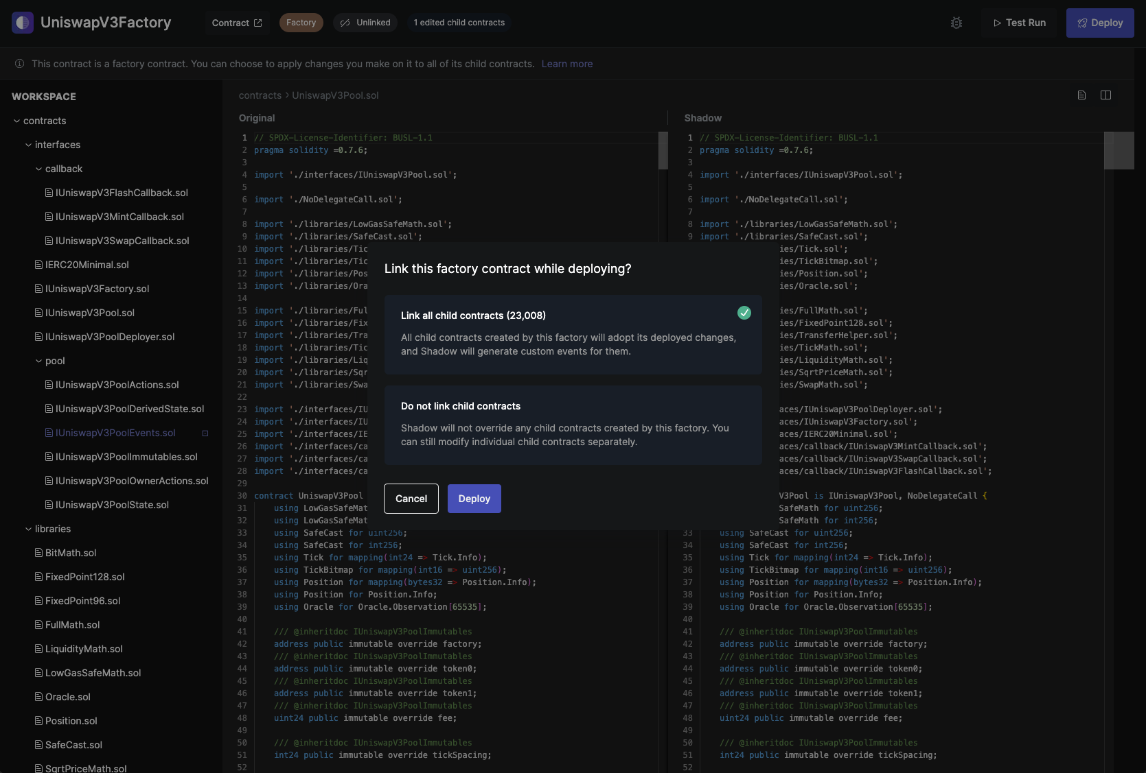Shadowing each pool contract individually would be a highly tedious and impractical process. Shadow provides powerful features that allow you to make one set of changes to a factory contract and link all of its child contracts to those changes.